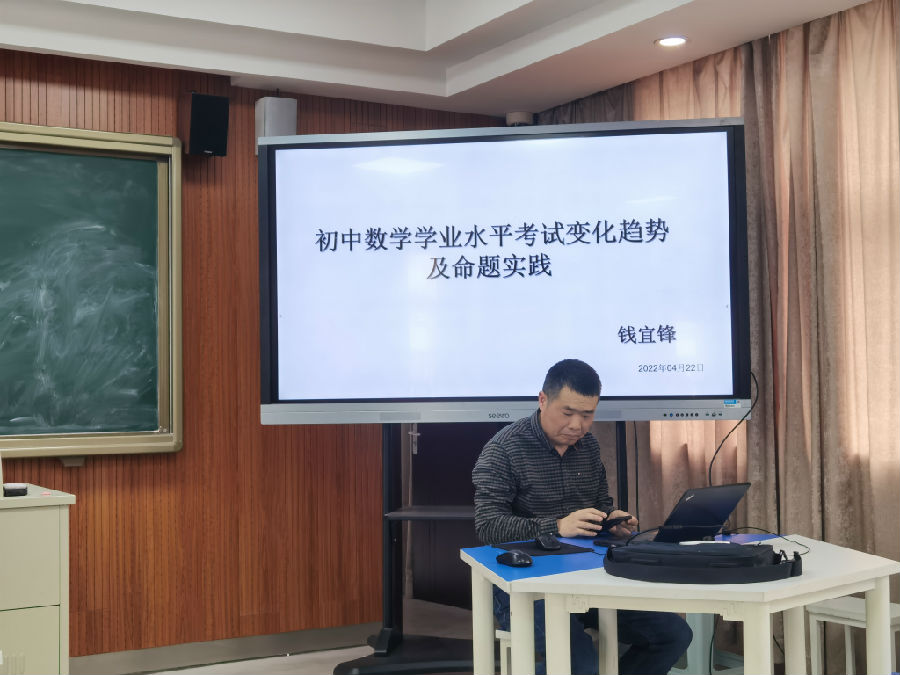 本次讲座钱宜锋老师主题为《初中数学学业水平考试变化趋势及命题实践》。钱老师主要从初中数学学业水平考试命题的特征、趋势以及实践三个方面为我们展开了重点讲解和分析,我们受益匪浅。