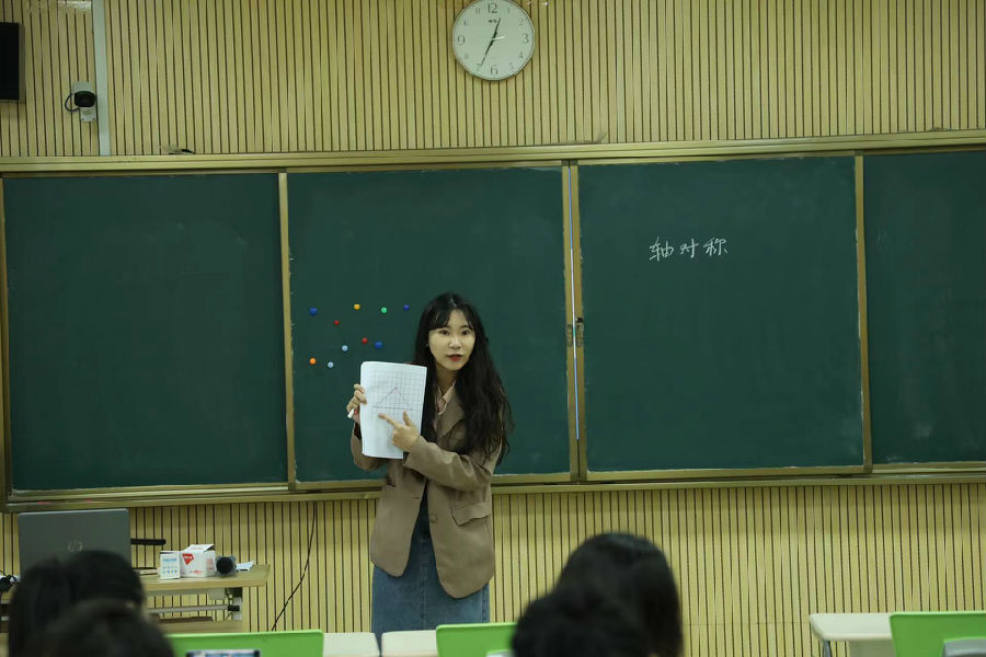 首先是何海丽老师的一节试课,内容是人教版四年级下册第七单元第一课时《轴对称》,她从学生已有的经验出发,通过复习激发学生已有知识,然后让学生通过移动一个点把三角形变成轴对称图形这个活动,让学生在操作过程中体会对称点到对称轴的距离相等这一特征,随后学习过特征之后,立马让学生利用特征去补全轴对称图形并总结画图方法,在习题中结合了课堂作业本,突破了本节课的难点。