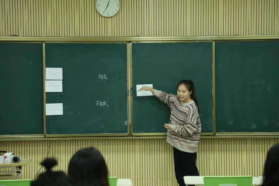张宇青老师的主题是《垂直与平行》主要通过三次画图来完成这节课的试讲,第一次画:让学生在白纸上随意画出两条直线,通过呈现直线不同的位置关系得到相交和不相交这两种情况:第二次画:让学生画不相交的两条直线,利用网格纸让学生理解并呈现出平行线的概念;第三次画:引导学生画出两直线相交成四个直角的情况,从而引出互相垂直的概念。