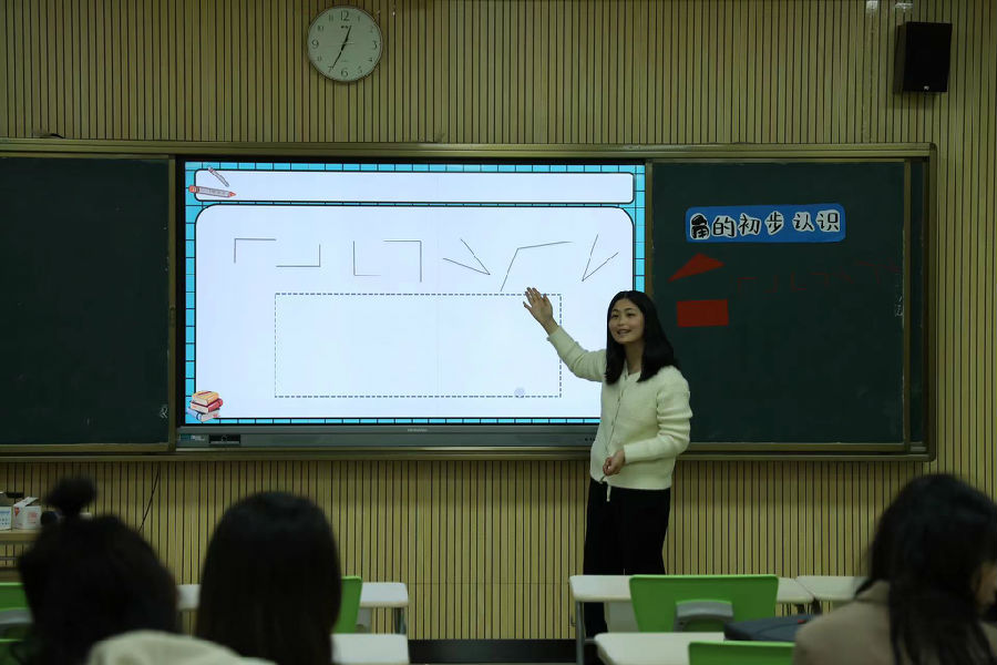 最后一节试课是由吴媚媚老师带来的《角的初步认识》,吴老师从观察平面图形中的“角”引入新课,从而把学生熟悉的平面图形中的角与本节课要学的角联系在一起,把新知识纳入原有的认知结构中。再设计了学生喜爱的“取一取、描一描、画一画、做一做、比一比”等实践活动方式,让他们通过亲自触摸、观察、绘画,把各种感官都利用起来,从而掌握角的知识,能比较角的大小。特别是学习角的大小与边的长短无关,与两边叉开的大小相关时,教师采用分层铺垫的方法,通过调动学生多种感官参与学习,理解并深刻的掌握角的大小的辨别方法。