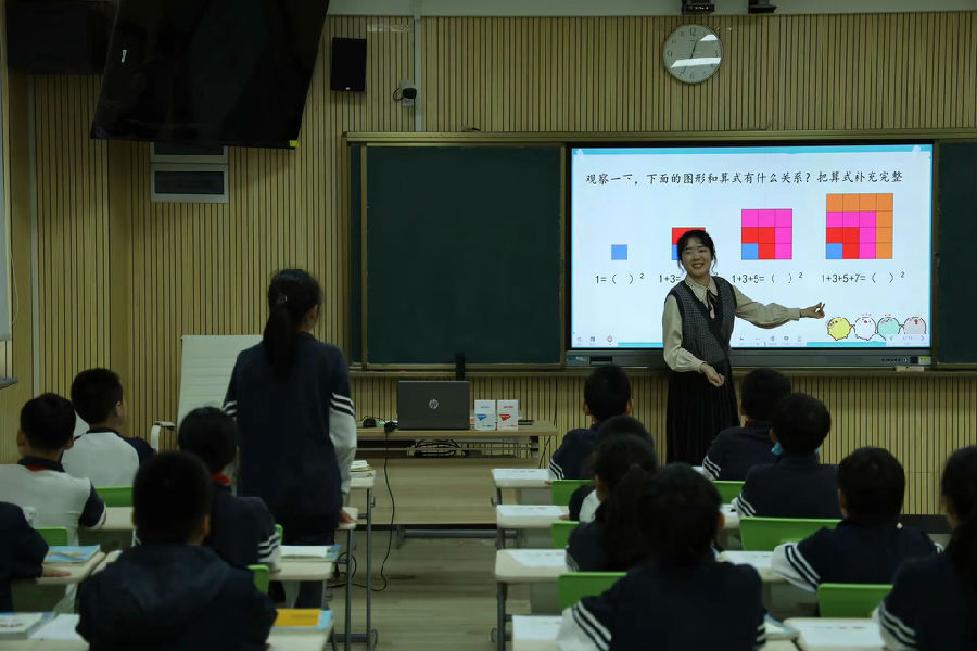 下午第一节课是由东道主金海湖小学戴心怡老师执教的《数与形》,戴老师从“数缺形时少直观、形缺数时难入微”引出课题。接着出示例1:一组正方形图与加法算式,引导学生说一说算式中的每个数对应图中的哪一部分,再通过观察、比较、讨论,得出从1开始,连续几个奇数相加的和就是几的平方。而后出示变式练习,学生根据算式先想象图形是怎么样的再运用规律算出结果,既发展了学生的空间观念,又渗透了数形结合的思想。再出示例2:引导学生先观察算式的特征再算一算。借助圆形图和线段图,帮助学生学会分析问题,感受极限的思想。