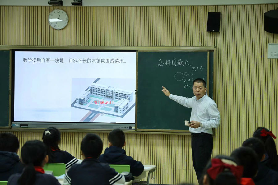 第二节课是由省特级陈加仓老师执教的拓展课《怎样围最大》,陈特直奔主题出示信息:教学楼后面有一块地,用24米长的木篱笆围成菜地。课中充分围绕“围成哪个图形的面积最大”及“为什么半圆面积更大”“为什么面积会越来越大”等关键性问题展开。从没靠墙到一面靠墙、两面靠墙,启发学生思考为什么围成圆的面积最大转变成半圆的面积最大再拓展到围成个圆的面积最大…从靠墙到穿墙,引导学生在多次对比中发现数学的内在规律,在变与不变中体验数学的无穷魅力,让数学变得有趣又好玩。