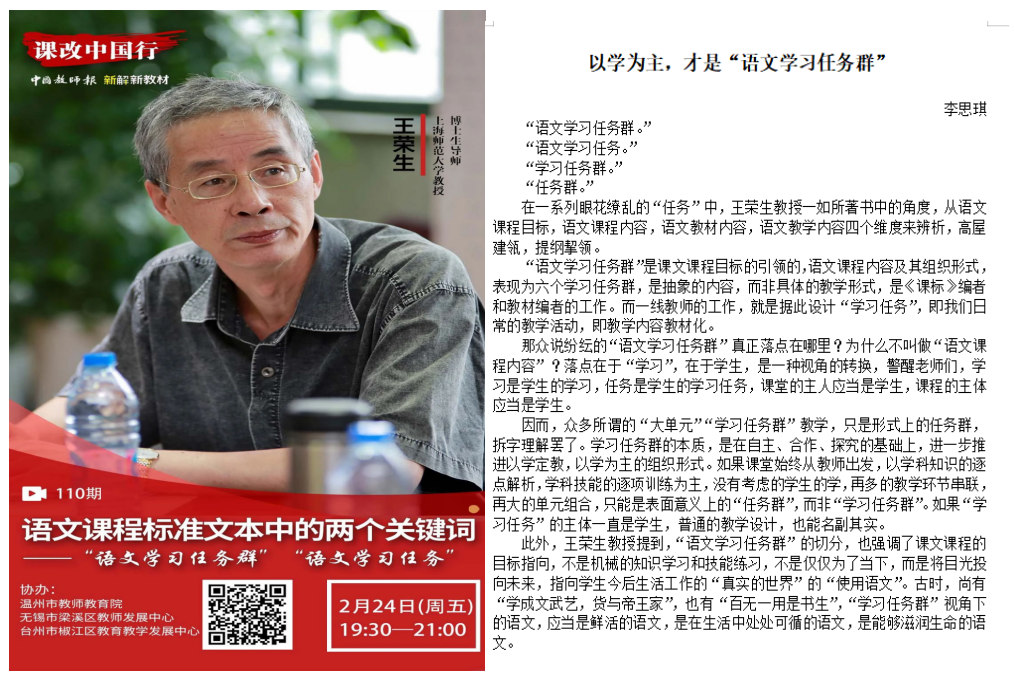 如何理解“语文学习任务”?如何理解“语文学习任务群”?如何准确把握语文新课程标准?带着一系列的困惑,柯珂老师工作室学员一起聆听学习了王荣生教授的专题讲座:《语文课程标准文本中的两个关键词——“语文学习任务群”“ 语文学习任务”》。