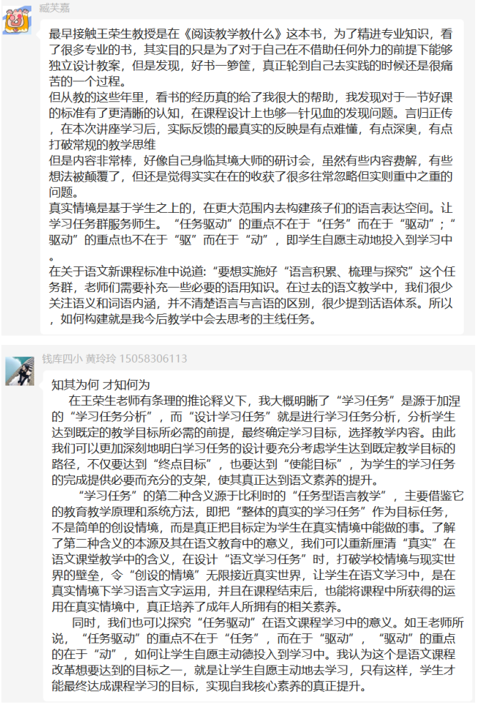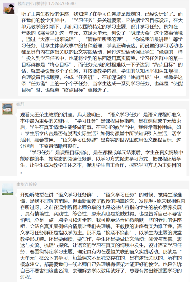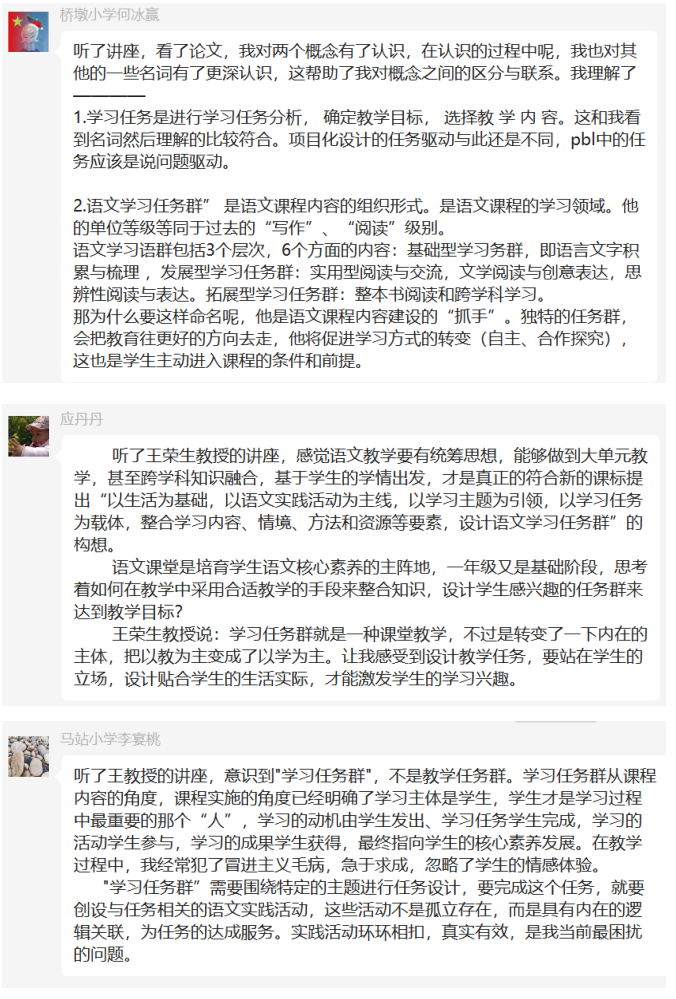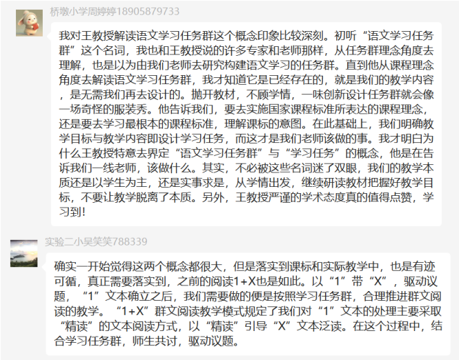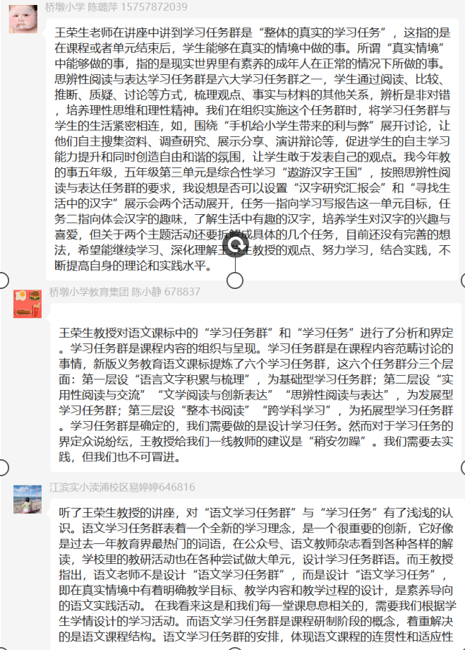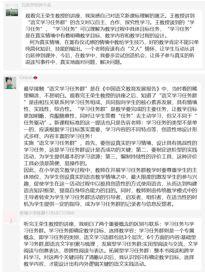 每位学员在观看后分享了自己的心得体会,柯珂老师指出:学员们能基于自身去谈收获,或者是困惑点,都是很好的思维路径。其次在统编教材滞后于课标的情况下,确实在理解与实施过程中会有很多困难,但是更多的是要看到亮光与希望。“学习任务”和“学习任务群”是接下来语文实践研究的原点。最后鼓励学员们多听多学习,结合自己的课堂,一小步一小步地向前迈。