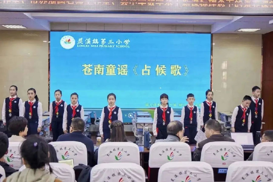 当天的活动在苍南县灵溪镇第三小学孩子的暖场节目——苍南童谣《占候歌》中拉开了序幕。苍南县灵溪镇第三小学是苍南童谣基地,苍南童谣是近几年学校的特色文化。