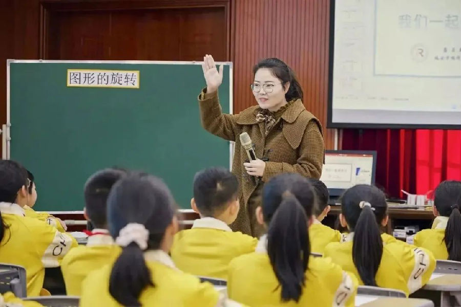 第二节课是由瑞安市教坛新苗瑞安瑞祥实验学校的蔡若朦老师和五年6班的学生带来的《图形的旋转》课例展示。 蔡老师的课堂基于学生的学情,以学生的前测结果作为学生认知的起点,结合小学阶段学生空间感知的特点,设计了“旋转的辨析”——“旋转的表达”——旋转“点”、“线”、“面”等学习活动。让学生经历说一说、想一想、转一转、画一画的过程,进一步理解旋转的知识,掌握旋转画图的方法,发展学生的空间观念。