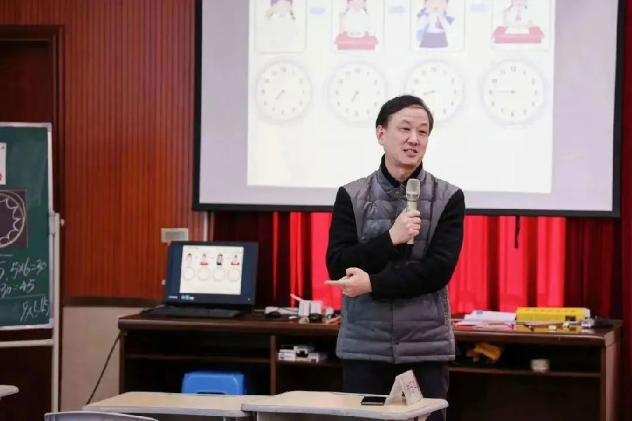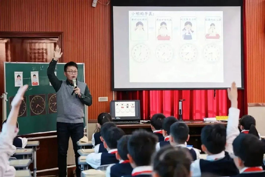 第三节课是由温州市教坛新秀瑞安市锦湖实验小学的白雷老师和二年4班的学生带来的《认识时间》课例展示。这是一节极其富有创造力的课。本课基于《认识时间》的课例,通过小明早晨活动的4副图片,按照如下顺序“说图意——排序图片——出示钟面——教师提出问题——辩证强化,解决问题——学生提出问题——解决问题”,以强烈的逻辑性和完整性,把整堂课由具体现实到“认识时间点”,循序渐进地过渡到“理解经过的时间”。