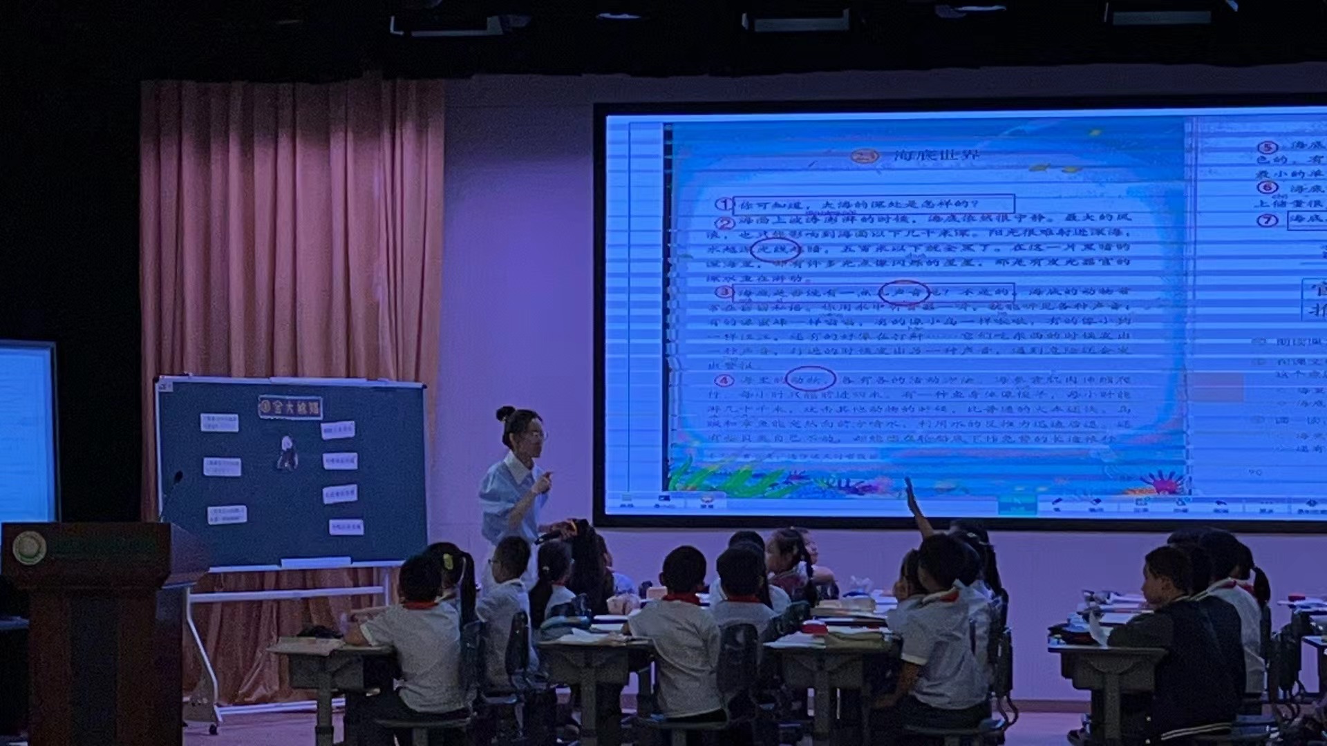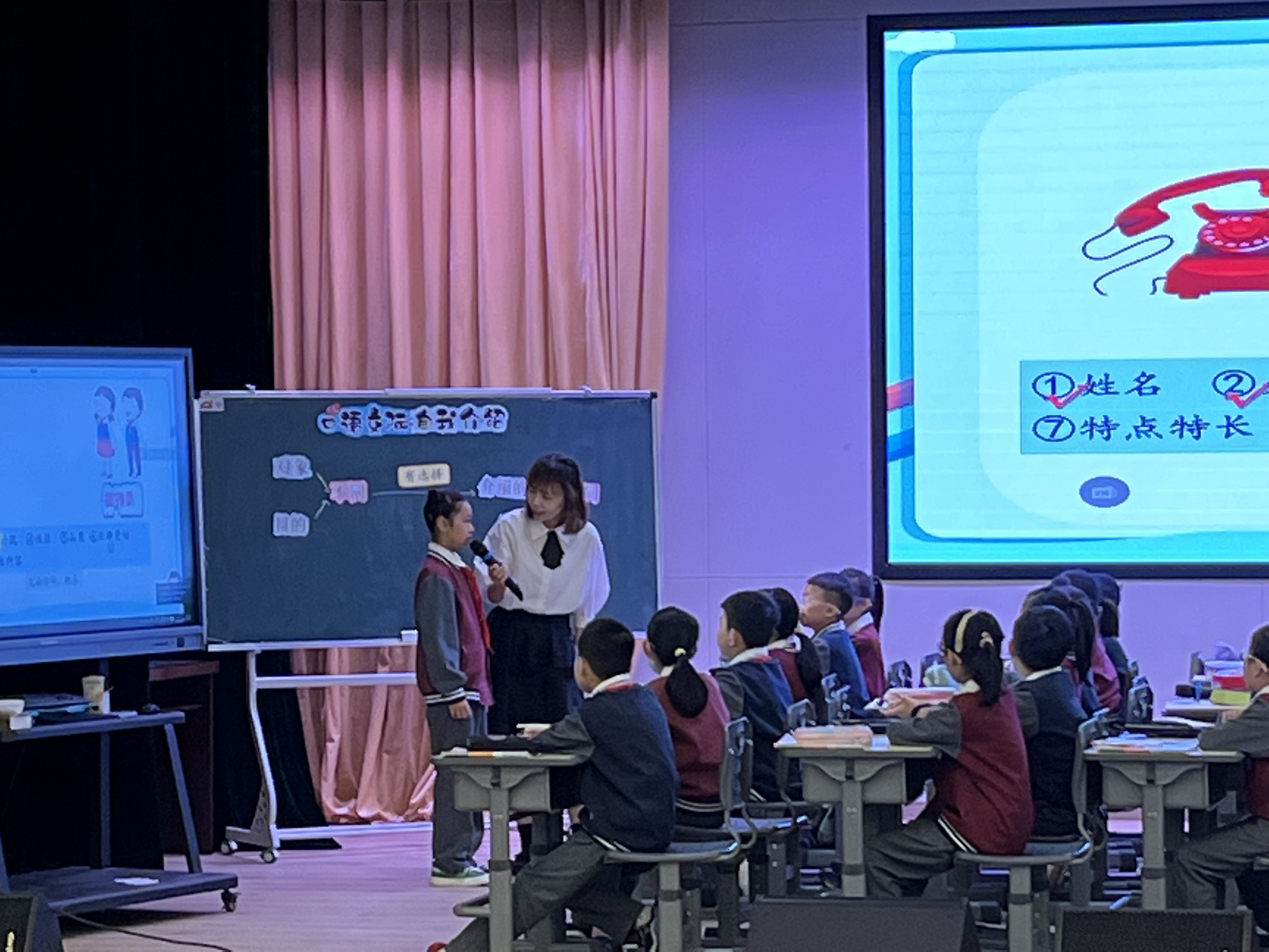 第一节课,由瑞安市阳光小学的胡淑晶老师和她的孩子们带来的《口语交际:自我介绍》一课 。胡老师注重情境的连贯性,通过应聘接待员、模拟电话接人、让学生直接到台下与新老师进行互动等学习任务,让口语交际在真实情境中实践。这堂课让我们看到了独具创新的课堂创设。
