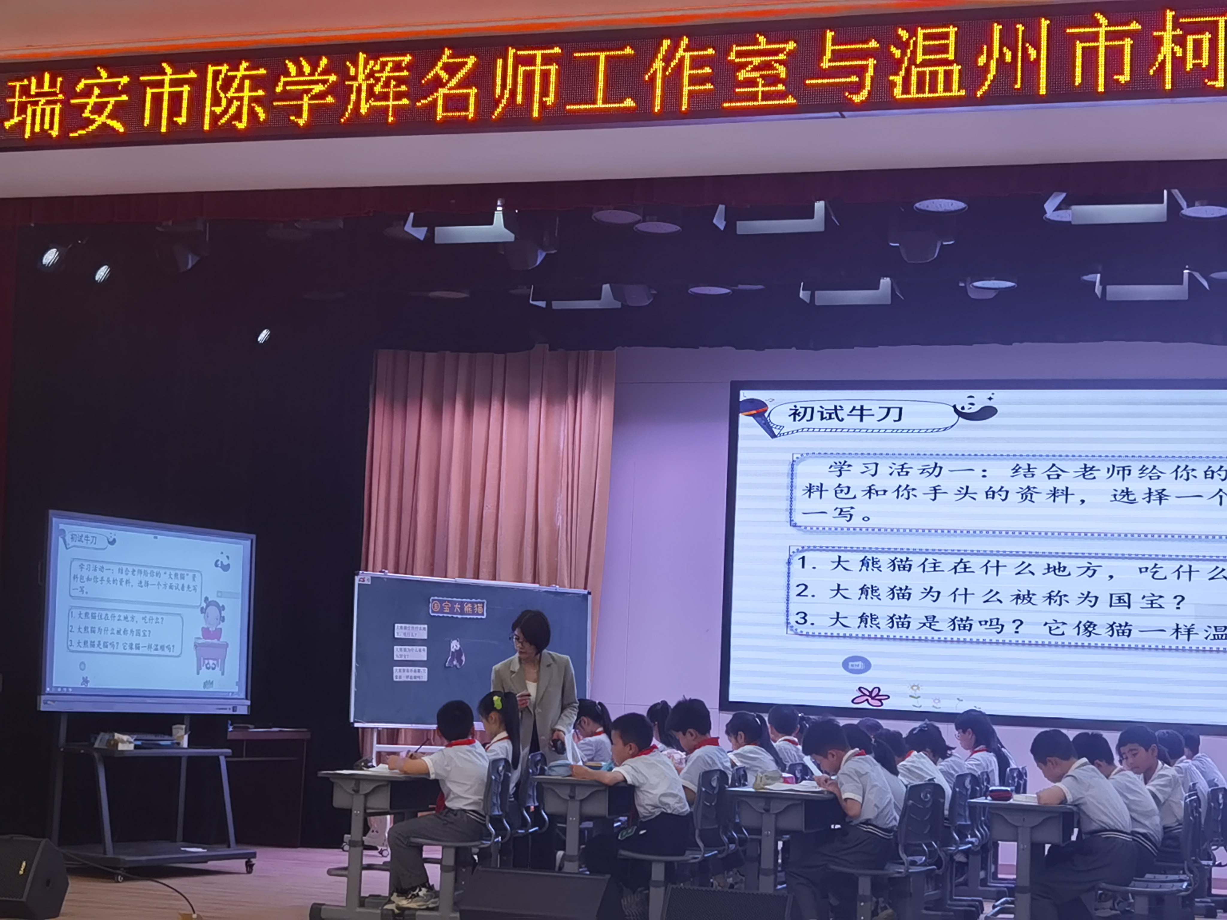 第二节和第四节课,由工作室成员苍南县桥墩五凤小学的钟小金老师和苍南县莒溪小学的夏风老分别执教三年级下册习作《国宝大熊猫》第一课时和第二课时。钟老师创设给二年级小朋友介绍大熊猫这样的学习情境,引导学生学习整合信息。然后围绕整合后的三个问题,写一写大熊猫,最后依据评分标准进行修改。钟老师带来的精彩课堂,让我们看到了习作课堂的整合性、恩维性与创造性。夏老师先让学生回顾已学过的,然后展示学生的两篇作品,和学生一起交流讨论,围绕上面三条标准进行修改。夏老师通过搭建支架“熊猫讲解员”擂台赛,让学生结合本单元阅读文章,用上设问句和过渡语,连接三个零碎的片段,形成一篇小短文,有趣地向苍南的二年级小朋友介绍。