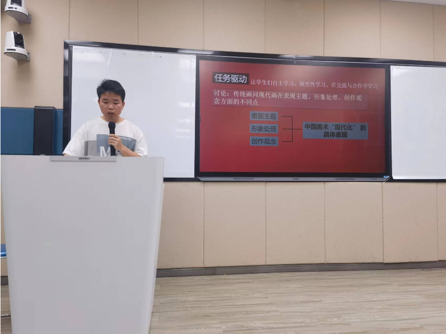 接着由泰顺职教中心的郑成龙老师带来说课展示《从传统到现代》。郑老师从教材分析、学情分析、教学目标、教学重难点等七个方面展开说课。通过赏析艺术作品,形成图像学的鉴赏方法,介绍的是二十世纪初东西方文化碰撞背景下对中国美术的影响,了解艺术家笔下社会生活的真实风貌。