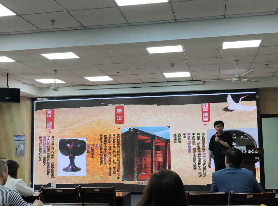 然后由中国美协会员、瑞安职业中等专业教育集团学校的高级教师韩正鑫老师带来精彩纷呈的讲座《工作室模式中的漆艺课程建设》。韩老师向我们介绍了2016年至今我校非遗漆艺课程的建设发展,分享了在课程教学中积累的教学经验和工作室建设成果,让我们看到了韩老师的艺术天赋和对艺术的执着。