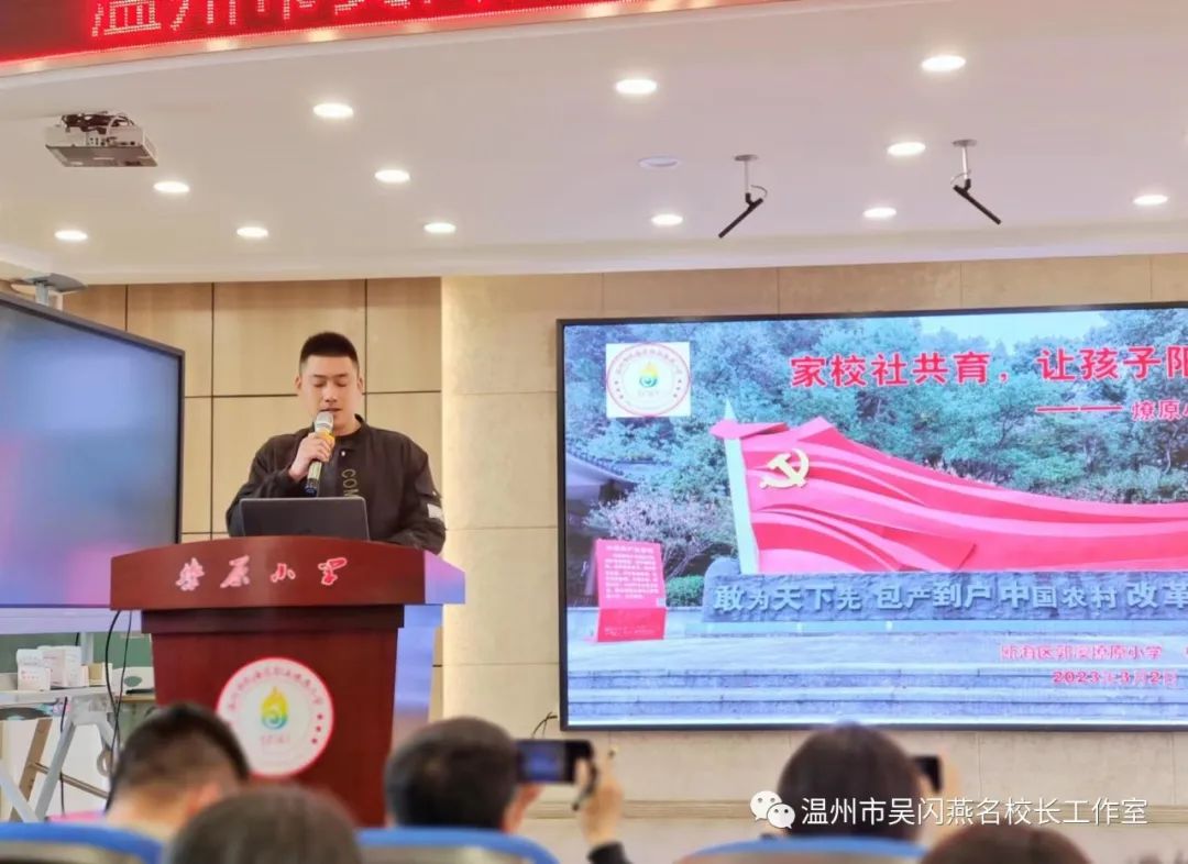 上午11时,工作室成员来到瓯海区郭溪镇燎原小学。“满树和娇烂漫红,万枝丹彩灼春融”。在周建勇校长及学生讲解员的引领下,充满艺术感的长廊、富有特色的成长银行、有趣的羊圈、智慧农场等教育场域创设让人印象深刻。 活动开始,燎原小学副校长林辉主题分享《家校社共育,让孩子阳光》。他从立德树人,精彩活动助推习惯养成;开拓创新,共同建设儿童友好阵地;持之以恒,赋能教师团队不断发展;自助管理,打造可爱童趣校园文化;美化校园,场域创设环境日新月异;家校共育,助力学生健康文明成长六个角度阐述了燎原小学德育工作新样态。