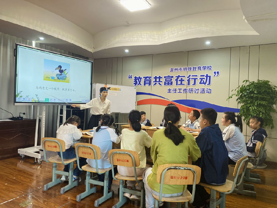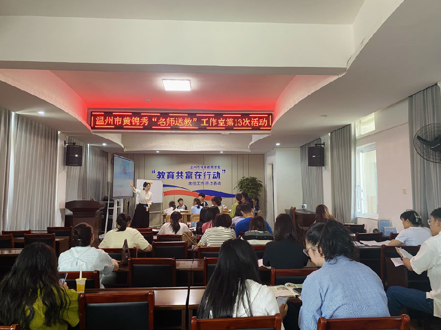 为促进我校教师的专业成长,增强名师工作室的辐射引领作用,2023年5月26日,温州市黄锦秀“名师送教”工作室第13次活动在苍南县特殊教育学校举行。本次特邀温州市名教师周洁静老师参与指导。活动分课例研讨、说课评课专题讲座两个环节。