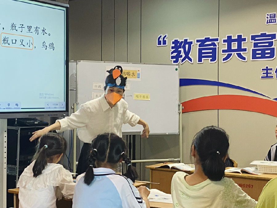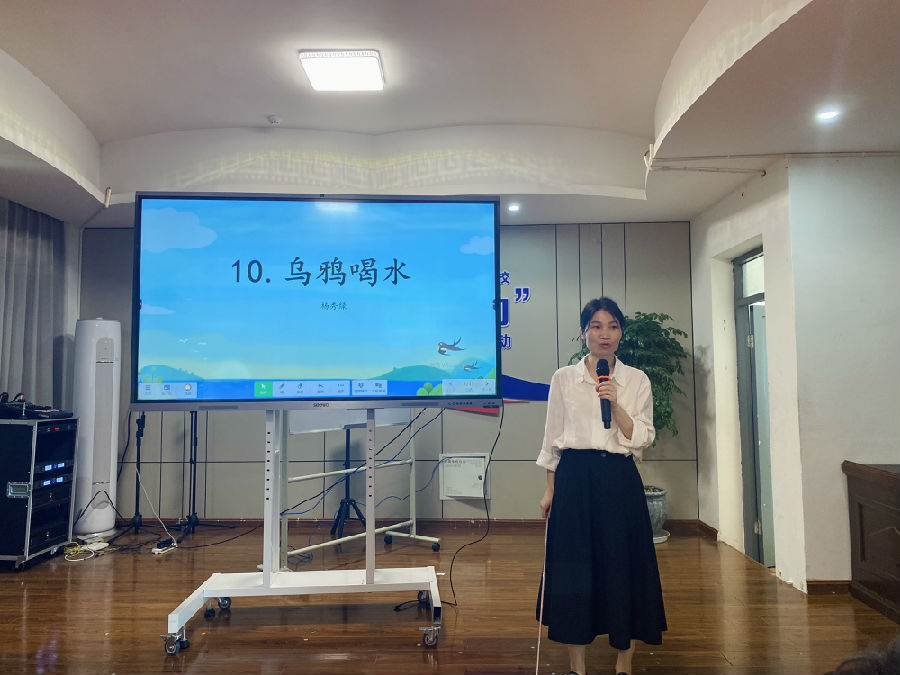 上午第一环节为课例展示。杨秀绿老师在教学《乌鸦喝水》时,用创设情境的方式带领学生进入文本,在情境中采用图片、视频、演示等多种方法,调动学生视觉、触觉、听觉多种感官参与学习,同时通过指名读、跟读、边演边读等方式,使学生在真实的语言实践活动中感知语言、理解语言、运用语言,提高语文素养。