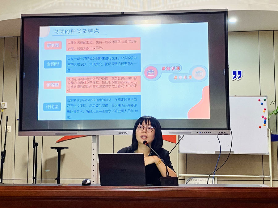 说课能力是教师一项必备的教学基本功,为了夯实工作室学员的教学基本功和教学水平,帮助青年教师参加市坛说课评选做准备。下午第一个环节,周洁静老师以《参评视角下特教教师如何说课》为主题,从说课的概念、说课的种类与特点、如何写好特教说课稿、如何说好特教课堂教学四个方面为老师们详细地进行培训。周老师指出:“每篇课文、每课时的教学都有其重点所在,教师要在了解学生学习起点的前提下,准确把握教学重点,说课时一定要说明运用了哪些教学策略来突破某个教学重点的。”