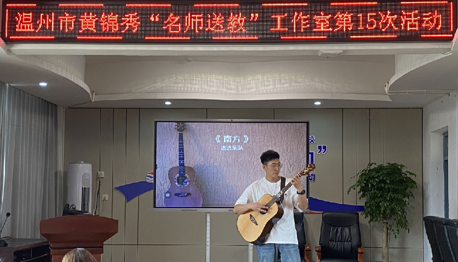 活动第二环节为工作室学员研修成果汇报。学员代表李鑫老师以吉他弹唱的形式拉开了序幕,正如《南方》歌词所说“时间过得飞快,转眼这些已成回忆,每天都有新的问题,不知何时又会再忆起”,值此结业之际,学员们也是百感交集。