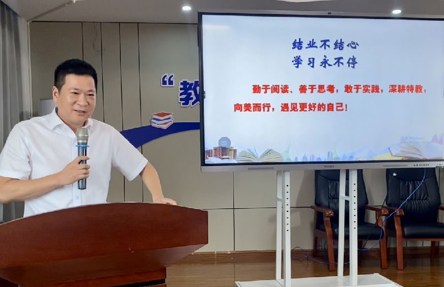 活动最后一个环节,苍南县特殊教育学校林成校对工作室两年来的研修进行了点评,他充分肯定了工作室主持人及学员们取得的成绩,特别感谢黄锦秀名师工作室对苍南特殊教育学校的帮助,他强调:“一个人,可以走得很快;一群人,可以走得更远”,工作室就是为了将一群志同道合的人聚在一起,共同探讨、共同学习、共同进步的地方。”他指出了“坚持”对特殊教育老师的重要性,心之所向,身之所往,他希望全体学员在接下来的研修路上,坚持学习,多向身边优秀的老师看齐,以时不待我的状态迎接未来的挑战。