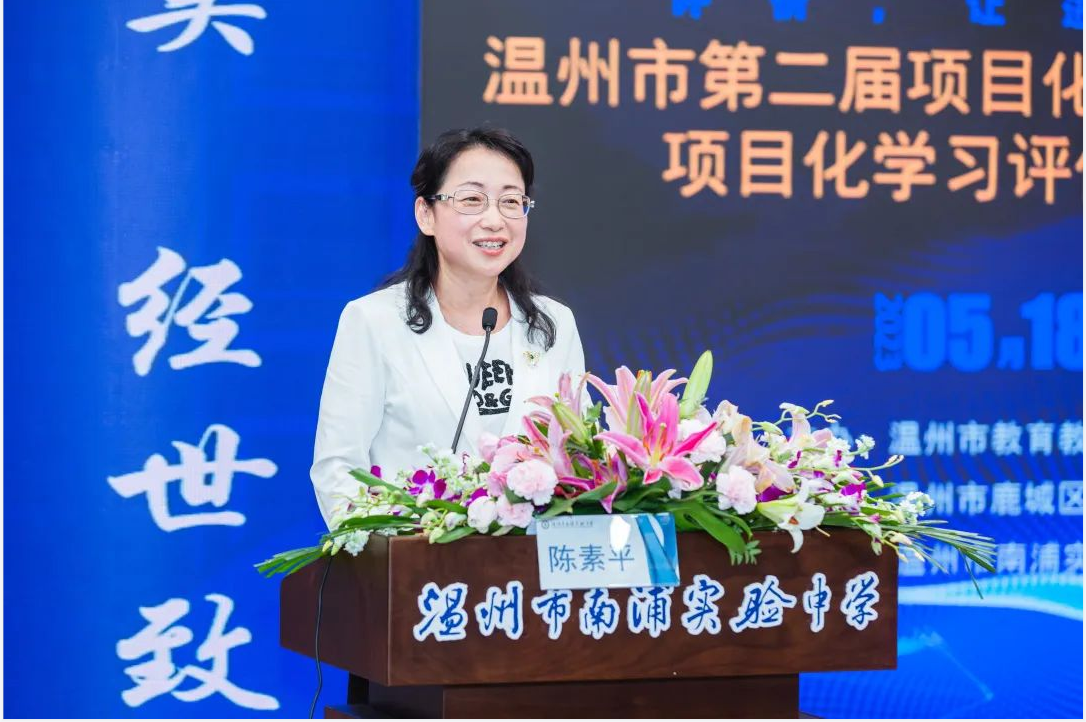 温州市教育教学研究院首席研究员陈素平作总结发言,陈老师提出,理解把握了“评价即学习”的本质,打破学科边界,聚焦问题、协同合作,构建出基于问题解决的“学、研、督”三位一体评价模型,探寻出一条契合而实际的教研路径,为温州市项目化学习的发展与推进做出了重要贡献。
