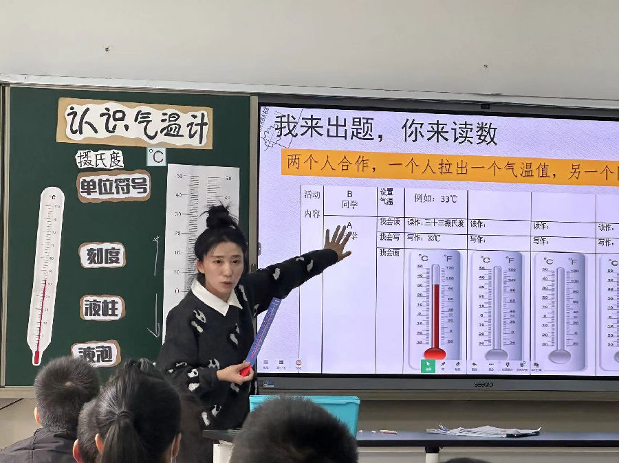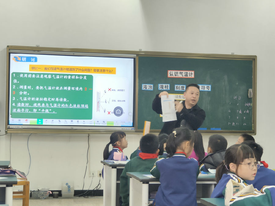 杨艳老师通过课前谈话:天气怎么样?聚集冷热的描述,气温与生活息息相关。杨老师引导学生回顾水温计的基本组成,提出水温计可以用于测量气温吗?组织学生研讨,发现差异。通过气温计再设计,学生分享我们修改的气温计设计,对比真实气温计,发现不同。通过读一读教室气温,交流读数结果,聚集如何读数和方法。紧接着挑战零下温度,教师出示气温计模型,照片展示,让学生说一说读数结果和方法。聚焦0下读数的方法指导。通过我来出题,你来读挑战活动,进一步强化对气温读数。最后在拓展环节,链接生活,让学生了解生活中与气温相关的事例。