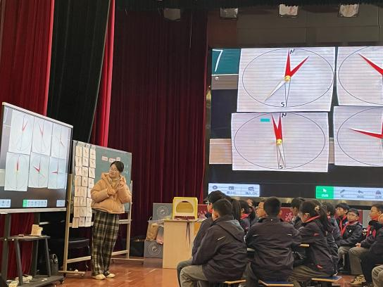 黄婷婷老师创设情景,铜导线可以让小磁针偏转吗?重走科学家之路。播放视频,通电导线,惊人发现。提出驱动问题,奥斯特当时有什么发现。让学生通过亲历奥斯特实验,针对观察到的现象提出自己的观点,通过分析推理建立观点与证据之间的联系。学生基于所学知识设计实验,能从现象的变化进行分析,推理举证电转化磁的科学过程,知道通电导线具有磁性,电可以转换成磁。出示奥斯特更多的研究,与科学家同行。最后学以致用,课后让学生检测小电池是否有电。