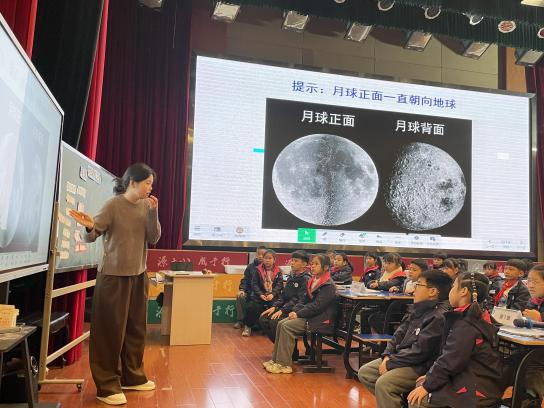 杨老师通过核废水排放影响人类生存问题引出“人类移民计划”引出课题,针对“月球是否适合人类生存”这个问题,学生通过课前调查资料表明自己的观点,再用视频补充月表环境。然后图片观察月表地貌并提出环形山可能成因。实验前让学生交流模拟的材料、方法。杨老师通过指导手册指导学生完成活动,通过投屏展示小组记录单和模型。再对比真实的环形山照片,找到陨石撞击形成环形山的证据。再次提问“月球是否适合人类生存”,并且提供“月质大发现”让学生寻找更多证据,或许未来月球居住的可能性。