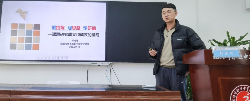 瑞安市塘下职业中等专业学校的郑成圩老师带来了专题讲座《重提炼明思路塑研值——课题研究成果和成效的撰写》。郑老师首先介绍了课题主报告的结构,帮助大家清晰课题研究的框架。紧接着,其着眼于课题研究的成果与成效,从成果与成效的区别、研究成果的撰写、研究成效的撰写、报告表述的注意点四个方面阐述了课题研究成果与成效的撰写。郑老师以优秀研究案例为依托,直观形象地阐述了研究成果提炼的思维与策略,成效总结的策略与注意点,为大家课题研究赋能。