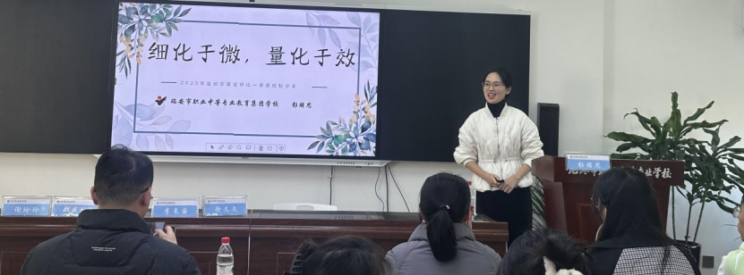 瑞安市职业中等专业教育集团学校彭朋思老师带来了成果展示《细化于微 量化于效——2023年温州市课堂教学评比一等奖经验分享》。彭朋思老师从“文件解读、构思心路、成果展示、成长与反思”四个方面分享了参赛经验,使大家真切感受到“细化于微 量化于效”的深刻含义。在收集资料时,收集教学设计、论文与数学杂志等资料,博观约取;在构思教学时,以生为本,数专融合,采取可视化教学与支架教学;在撰写教学设计时,注重措辞与文本可视化呈现样式,凸显设计亮点;在积极备赛时,善于借助团队力量,不断优化。