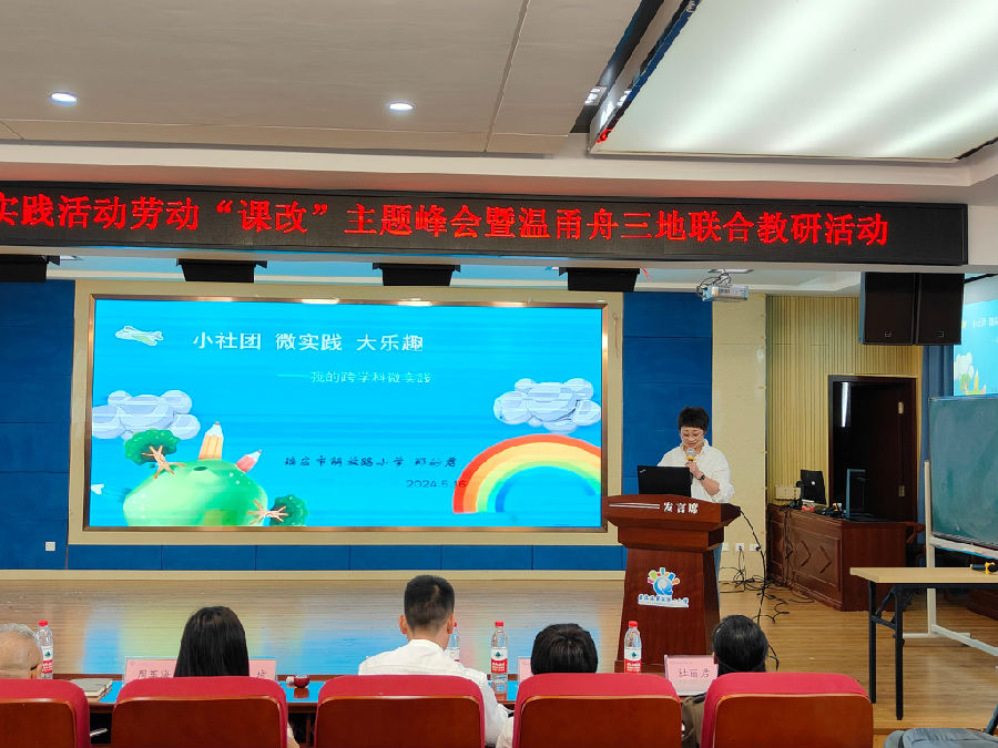 随后,瑞安市解放路小学郑妙君老师带来观点报告《小社团,微实践,大乐趣》。在郑老师的介绍中,孩子们通过社团组织、实践活动的方式,在生活中寻找童年的美好乐趣。
