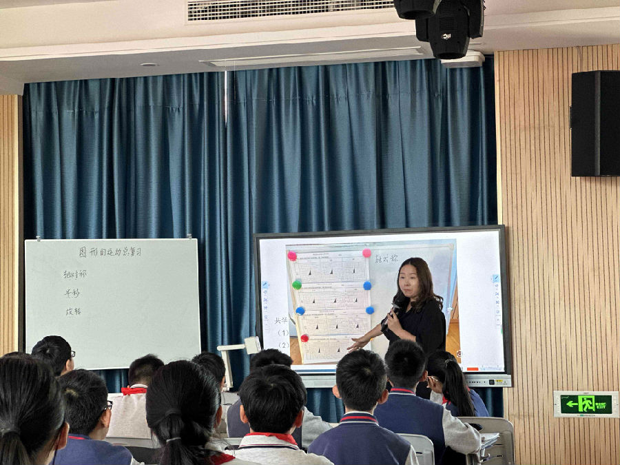 下午第一节课胡璐思老师和603班的孩子共同演绎了课堂《图形的运动总复习》。胡老师组织学生独立画出三角形分别经过轴对称、平移、旋转后的图形。通过小组交流,分享表达,变式练习,学生自主梳理出三种方式的特点和共性。在图形的运动中,胡老师还通过动画演示让学生直观感受点、线、面、体的变化,最后设计了相关习题挑战巩固知识。