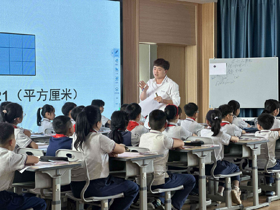 第二节是杨延龙老师展现了课堂《长方形和正方形的周长和面积的复习》,杨老师以幽默的语言,饱满的精神带领学生梳理长方形和正方形的面积与周长公式。整堂课由一张A4纸引发学生思考,学生通过动手操作,计算对比自主探究面积与周长的关系。