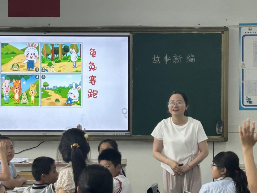 杨薛萍老师执教《故事新编》一课,这节课用四格图、图+文的导学单、问题支架、评价卡等对《龟兔赛跑》的故事进行新编。四格图依据学生熟悉的漫画中的四格图演变而来,把耳熟能详的故事《龟兔赛跑》分成四个部分,装入四格图,将“陌生”的工具“熟悉化”。表格中预测结果上下前后一对比,直观形象地呈现老故事整体构思的特点——情节大反转,帮助学生快速整体构思。图+文的导学单,借助暗示性的图形和生动的图示帮助不同层次的学生打开思路:兔子有什么特点,就有什么样的情节,激活了学生的思维,促进了求异思维的发展。