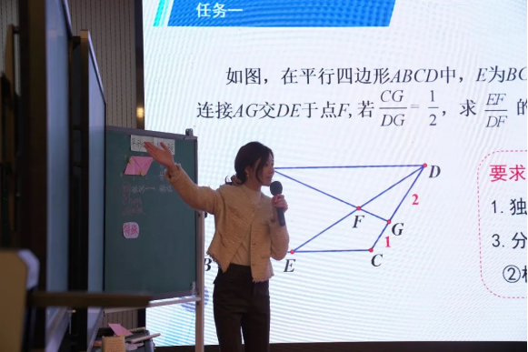 温州市南浦实验中学的王雯雯老师为我们呈现了《平行四边形与相似的邂逅》,这是一节是以数解形几何专题课。王老师以其独特的教学风格,将几何图形的“形”的位置与代数推理中“数”的量化完美融合,引导学生体验图形关系背后的数理本质。一堂课精彩纷呈,让在场的师生对相似结构中“形”与“数”的结合有了更深入的理解。