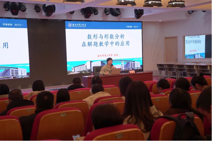 温州市第三中学的金苗老师为我们带来了讲座《数形与形数分析在解题教学中的应用》。金老师深入浅出地分析了数形结合的思想在解题教学中的重要性,指出:数量关系和空间图形是数学研究的两个主要方面,它们之间有着密切的关系,在一定条件上可以互相转化、是相互渗透。由数想形、以形助数,在“数形”中关联,在关联中建构,在建构中突破!讲座的分享为老师们提供了宝贵的教学策略。