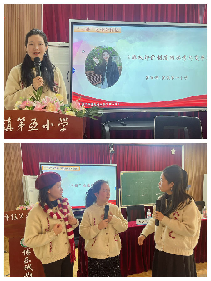接着,来自乐清市柳市镇第五小学的郑可旦和陈惠敏老师带来她们的“三讲”修炼之教育策略分享。郑可旦老师的《以爱为引,照亮孩子自信之路》,围绕着爱的引导,发现孩子们的闪光点,从而为孩子们创造展示的机会,通过家校合作,对孩子们进行持续鼓励与支持。陈惠敏老师的《幸福小脚丫,友好成长每一步》,聚焦与学生在班级中的幸福成长与友好相处,营造温馨班级氛围,培养友好相处习惯,关注个体成长需求,为为学生营造了一个温馨、友好、支持性的成长环境,让他们的每一步成长都充满幸福和喜悦。