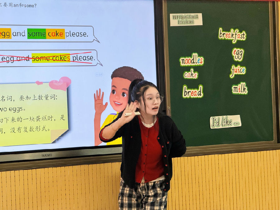 南盛洁老师的词汇课《PEP2 Unit4 Healthy food A Let’s learn》,从词汇学习切入,让学生在较大的语境中理解并操练新词汇,成功解决了“juice”和“noodles”等词汇的学习难点,并促使学生实现知识的迁移,为连贯表达积累了基础。在内化语篇阶段,南老师挖掘了“project”板块的活动,帮助学生了解健康餐盘的知识,体会“healthy”的含义。最后设置“healthy breakfast plate”活动,组织学生在讨论后进行改编创新,将餐盘与菜单的知识融合,实现了知识的迁移运用。