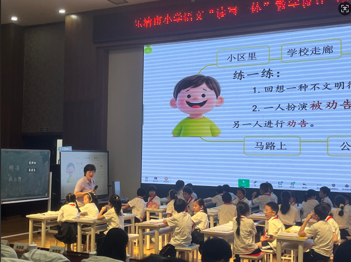 上午8:40,活动在宁波市名师李秀蕾校长执教的《劝告》拉开帷幕,首先李老师创设“追逐跑下楼梯”的危险情境,引导学生归纳劝说技巧——先称呼、不指责换位想、说理由、提建议。接着呈现“骑车不戴头盔”的生活场景,组织学生运用方法开展角色扮演,通过师生互评强化“说危害+给方案”的劝说策略。最后进入拓展环节,学生列举身边的不文明现象,小组合作设计劝告对话并展示。全程以情境驱动,通过“示范学习-迁移应用-拓展实践”的阶梯式训练,让学生在真实语境中掌握劝告技巧,同时培养安全意识和文明素养。