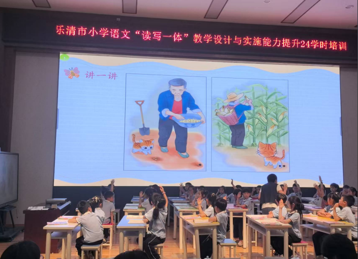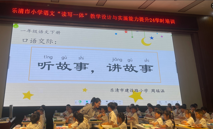 乐清市建设路小学周瑶涵老师带来课例《听故事,讲故事》。课伊始,周老师创设“鹤鸣故事直播间主播选拔赛”任务情境,结合教材发布学习任务。通过自身示范引领,师生共同提炼听、讲故事策略;学生依托图画进行实践尝试,在互动交流中深化方法认知。课程收尾阶段,以选拔任务驱动,组织听、讲、评一体化活动,实现语言能力培养与核心素养提升的有机融合。