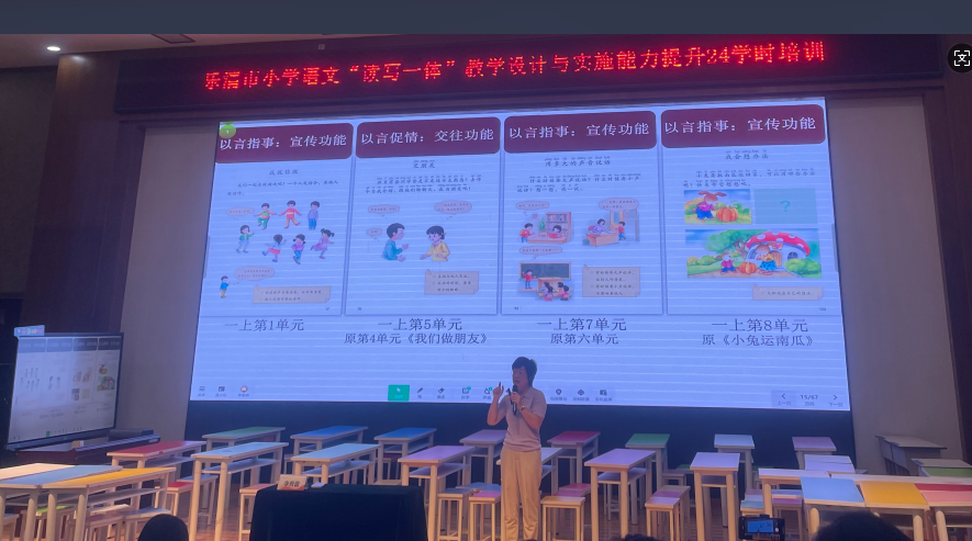 李秀蕾老师以专题讲座《场景化:口语交际新思考》为主题,系统阐述了口语交际的三大功能维度。她提出,“以言指事”的宣传功能需立足真实任务(如《做手工》中“按顺序介绍制作步骤”),强化逻辑表达;“以言促情”的交往功能应关注自然真诚(如“肯定补充”“眼神共情”策略),培养情感共鸣;“以言成识”的商讨功能则强调有理有据(如“求同存异”“柔性商量”),锤炼思辨能力。这一分类体系为教师精准定位教学目标、重构交际情境提供了理论支点。