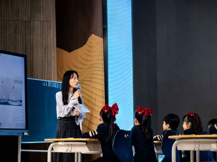 紧接着,龙湾的陈健老师与 301 班的同学们携手呈现了《形状与结构》一课。陈老师以经典的 “三只小猪建房子” 故事为情境主线,瞬间抓住了学生们的注意力。课堂上,陈老师引导学生思考不同材质、不同形状的房子为何稳固性不同,进而让学生动手研究不同形状在建筑结构中的稳固性。原本抽象难懂的结构知识,在充满童趣的故事与生动的实验中变得浅显易懂,极大地激发了学生的学习兴趣,让学生在玩中学、学中思,真正实现了知识的有效传递。